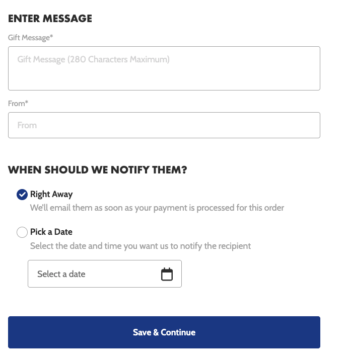 - Leave the rest to us—your recipient will receive a beautiful digital experience (to their email inbox) letting them know of your generous gift. Your recipient will enter their shipping address and choose the delivery date that works best for them. Once they complete the e-gift redemption, they'll receive an email confirmation.